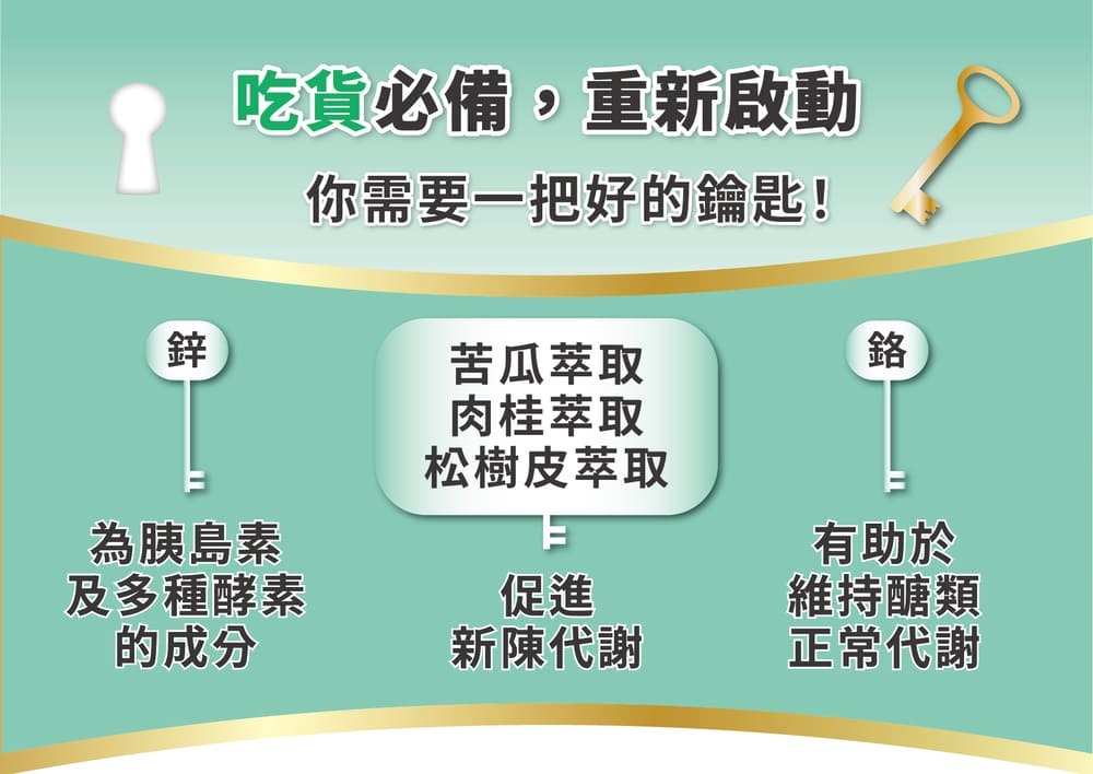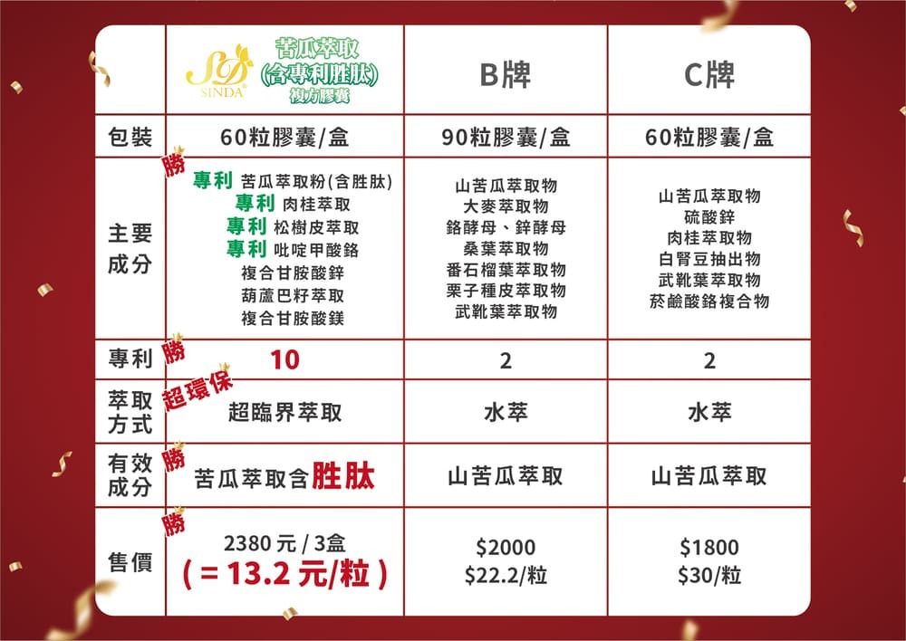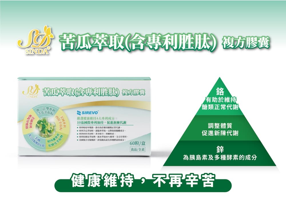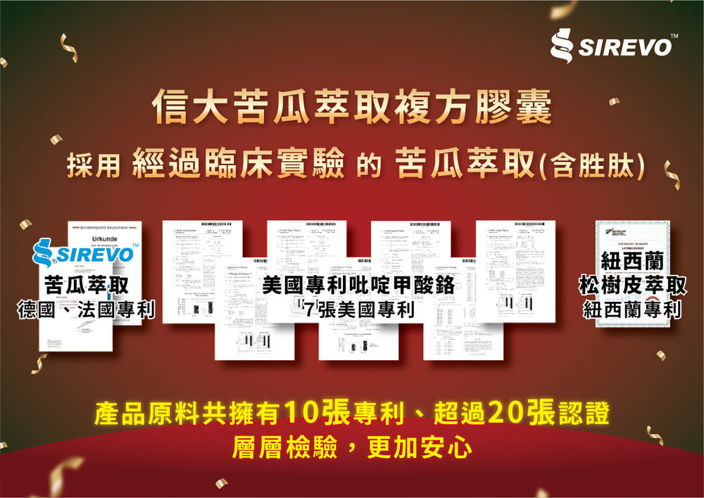 內容物:SIREVO™苦瓜萃取粉(含胜肽)(苦瓜萃取粉、難消化性麥芽糊精)、肉桂萃取、松樹皮萃取物、複合甘胺酸鋅(甘胺酸鋅、麥芽糊精)、葫蘆巴籽萃取粉、磷酸鈣、微結晶狀a-纖維素、複合甘胺酸鎂(甘胺酸鎂、羥丙基纖維素)、吡啶甲酸鉻