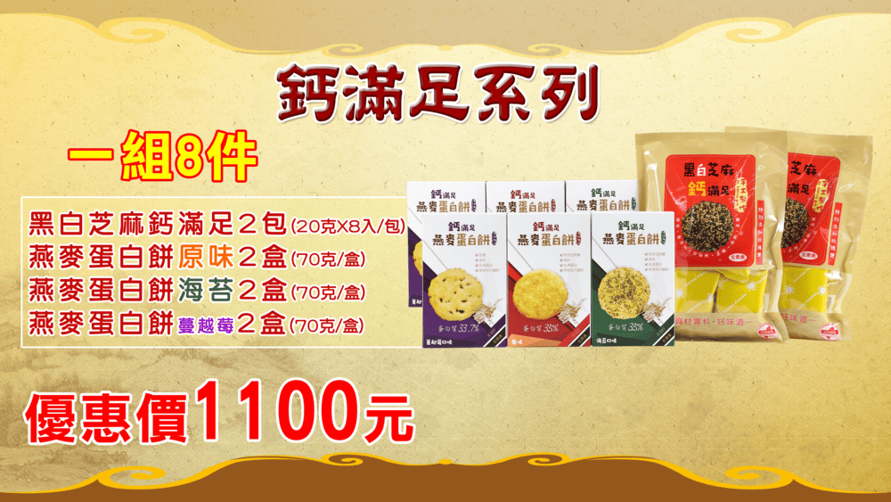 組合:黑白芝麻鈣滿足*2包、燕麥蛋白餅(原味*2盒、海苔*2盒、蔓越莓*2盒)