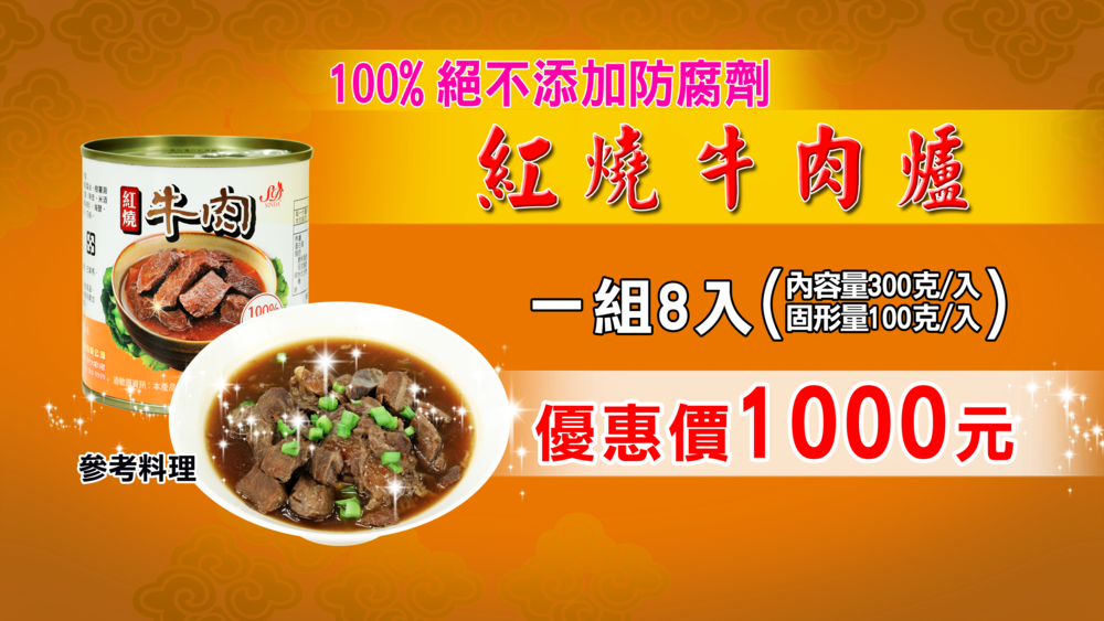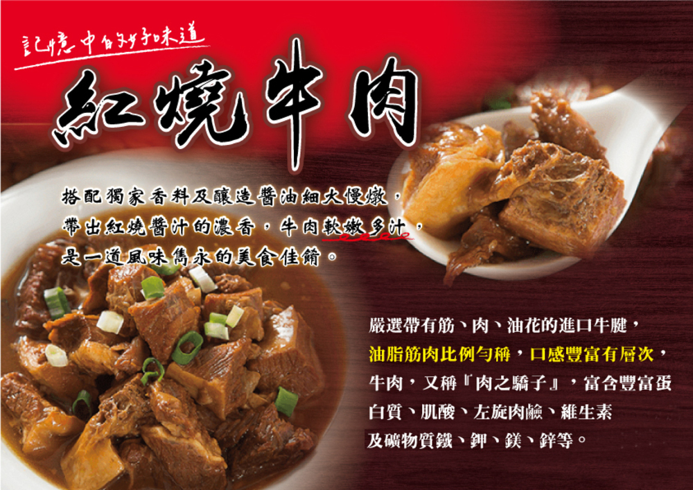 成份:水、牛肉、釀造醬油、樹薯澱粉、蔗糖、生薑、陳皮、米酒、L-麩酸鈉(調味劑)、海鹽、辣椒粉、八角、花椒。