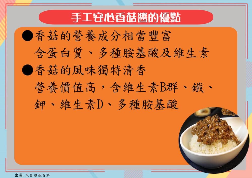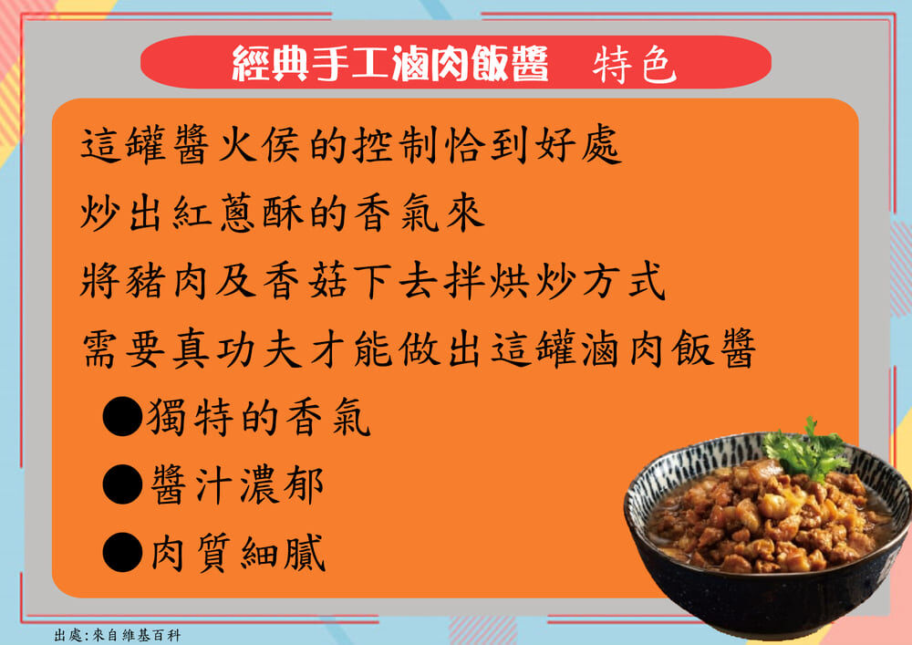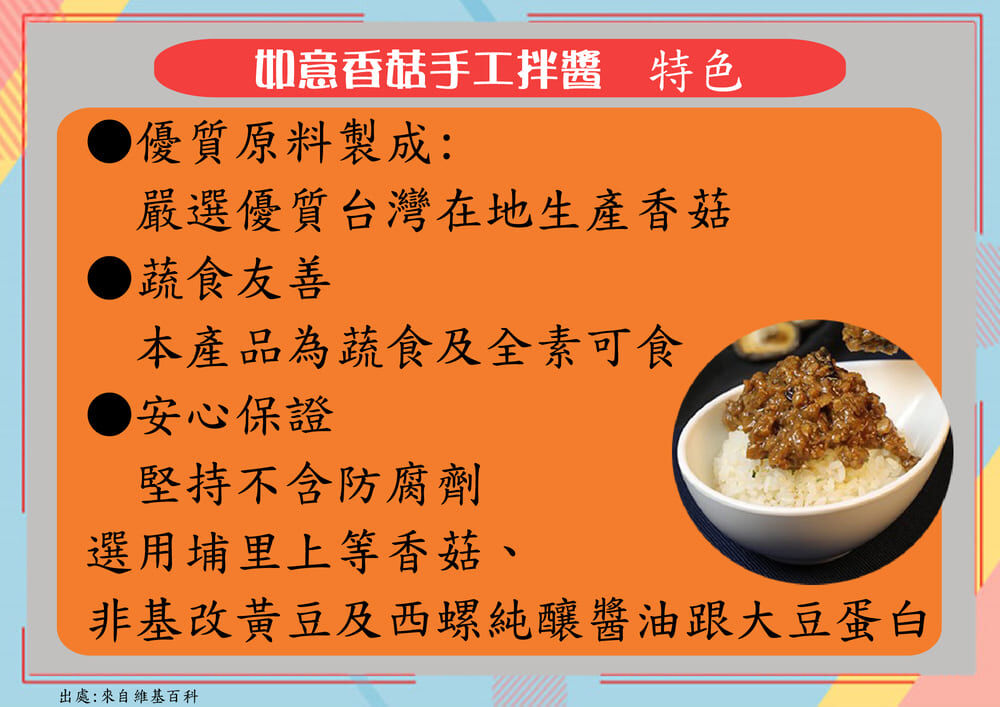 成份:黃豆油、黃豆醬油(非基因改造)、紅蔥酥(紅蔥頭、洋蔥頭、玉米澱粉、棕櫚油、小麥麩皮)、豬肉(產地:台灣)、糖、大豆蛋白(非基因改造)、香菇、甜味劑(D-山梨醇液70%)、琥珀酸二鈉、鹽、5’-次黃嘌呤核苷磷酸二鈉、5’-鳥嘌呤核苷磷酸二鈉、DL-胺基丙酸、香料、L-麩酸鈉、酵母萃取物、麥芽糊精、甘草粉(甘草、山奈)、五香粉(肉桂、丁香、小茴香、八角)