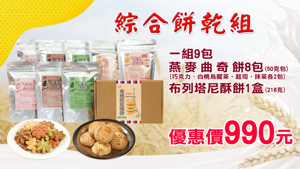 組合:燕麥曲奇餅(巧克力口味*2+白桃烏龍茶風味*2+起司風味*2+抹茶風味*2)+布列塔尼酥餅(原味)*1