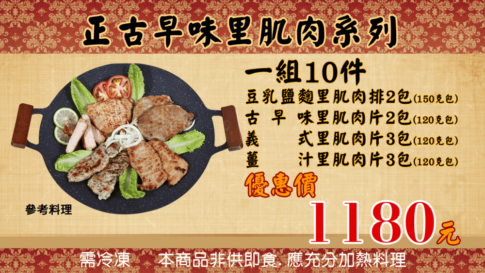 組合:古早味2包、豆乳鹽麴2包、薑汁肉片3包、義式肉片3包