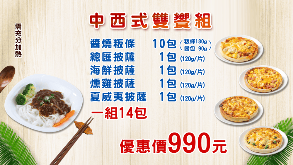 組合:粄條2大包(1包有5份)、海鮮披薩1塊、燻雞披薩1塊、夏威夷披薩1塊、總匯披薩1塊