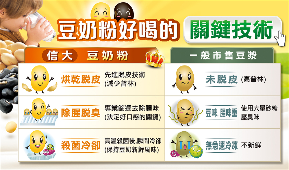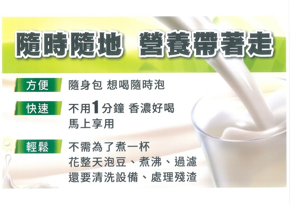 注意事項:請勿直接加入熱水,豆奶粉會凝結,並且會破壞其營養價值