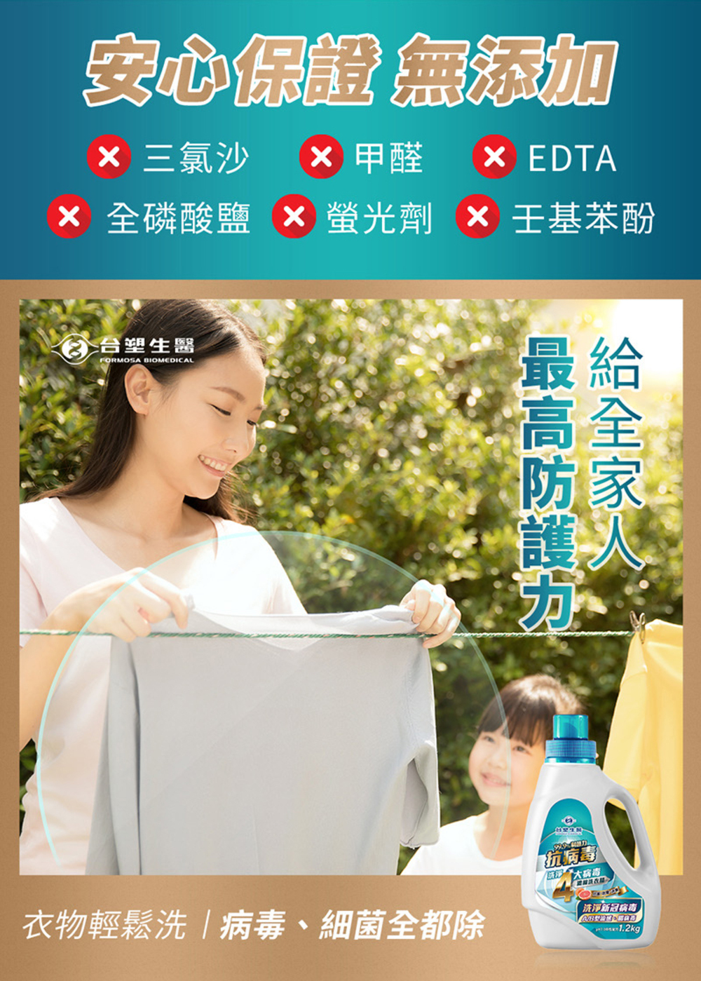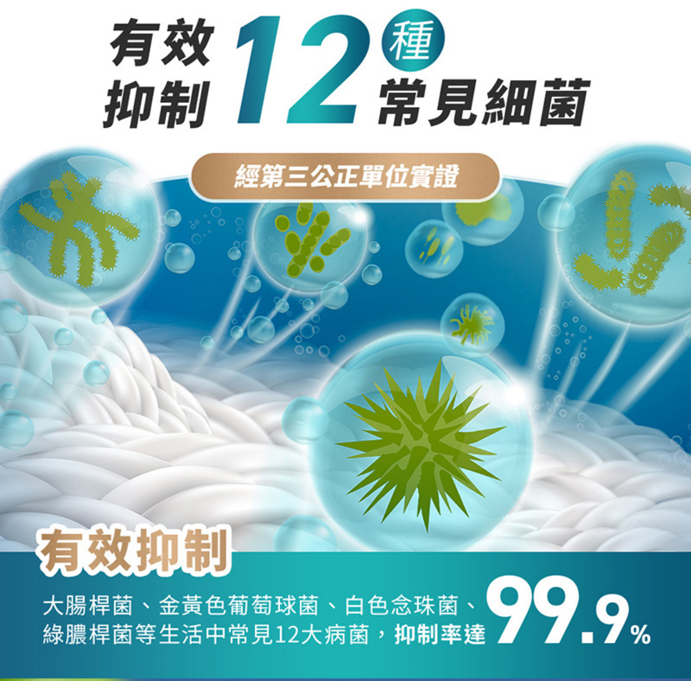 有效抑制4大病毒及細菌:添加高效「葡萄柚籽萃取」抗菌成分能有效抑制新冠病毒、A型流感(H1N1)、B型流感(維多利亞株)、腸病毒(71型、D68)等四大病毒及大腸桿菌、金黃色葡萄球菌、白色念珠菌、綠膿桿菌等生活中常見細菌。