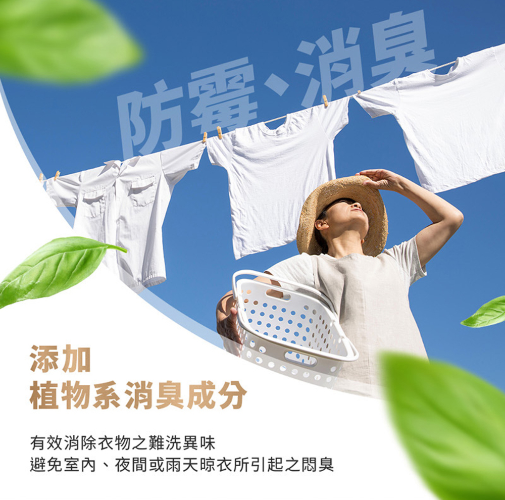 消除異味:運用「植物系消臭劑」可有效消除衣物沾染之難洗異味,並避免因室內、夜間或雨天晾衣所引起之悶臭。