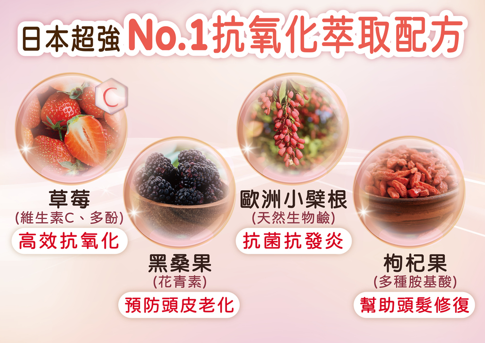 主成分:日本精氨酸、天然複合抗氧化萃取(葡萄多酚&維生素E)、白藜蘆醇萃取、VARRIER四莓果萃取、日本柚子果萃取、水解蠶絲蛋白、米胚芽萃取、維生素原B5、天然認證潔淨成分