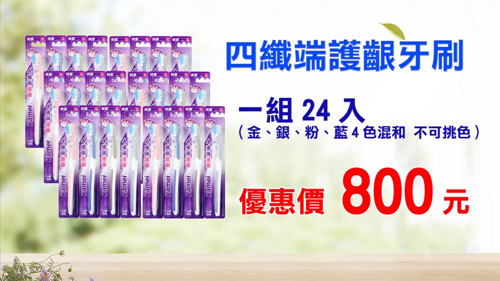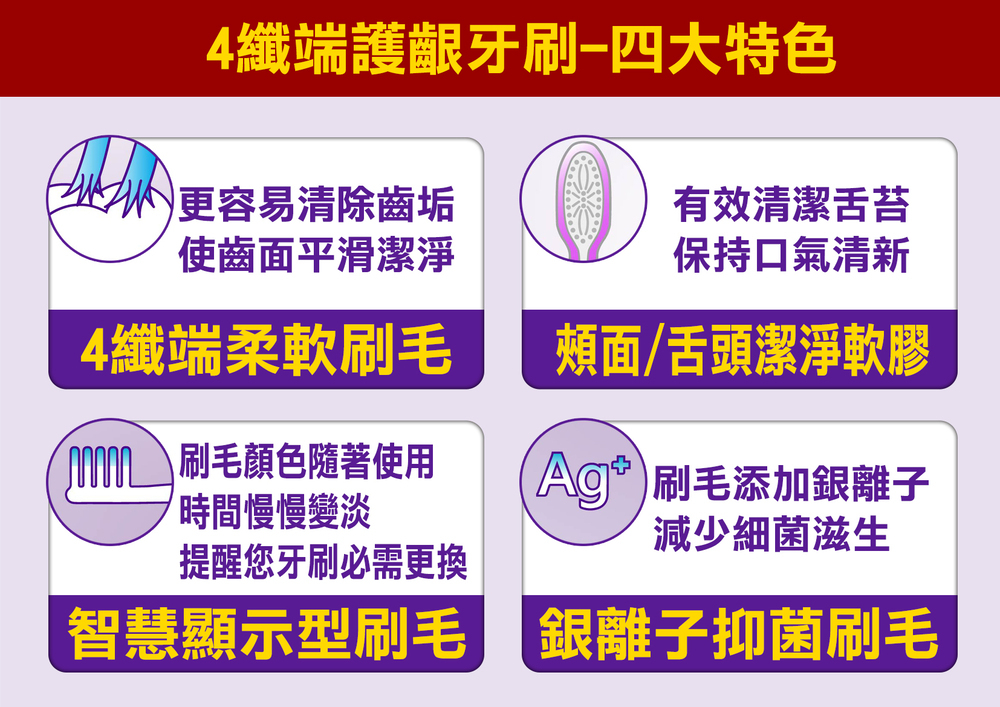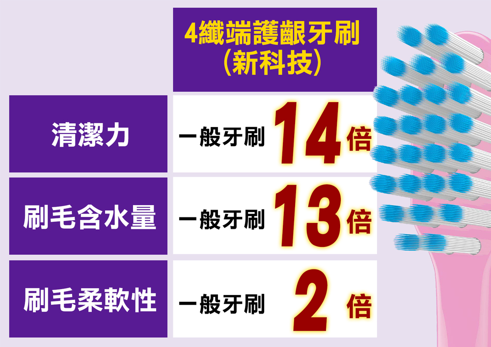 1、4纖端柔軟刷毛:創新的4纖端刷毛設計,能深入齒間,更容易清潔牙垢並同時呵護牙齒與牙齦。