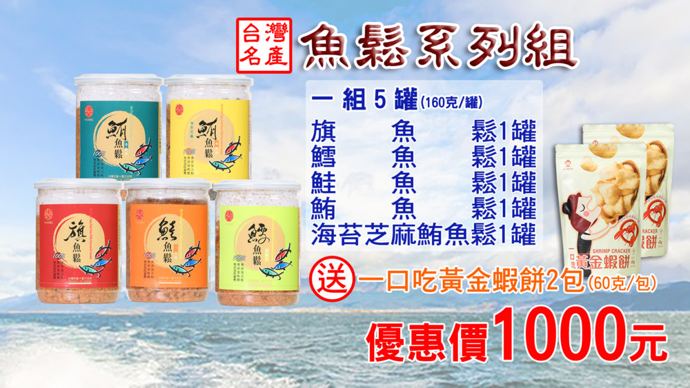 組合:海苔芝麻鮪魚鬆、旗魚鬆、鮪魚鬆、鮭魚鬆、鱈魚鬆各1罐+蝦餅2包