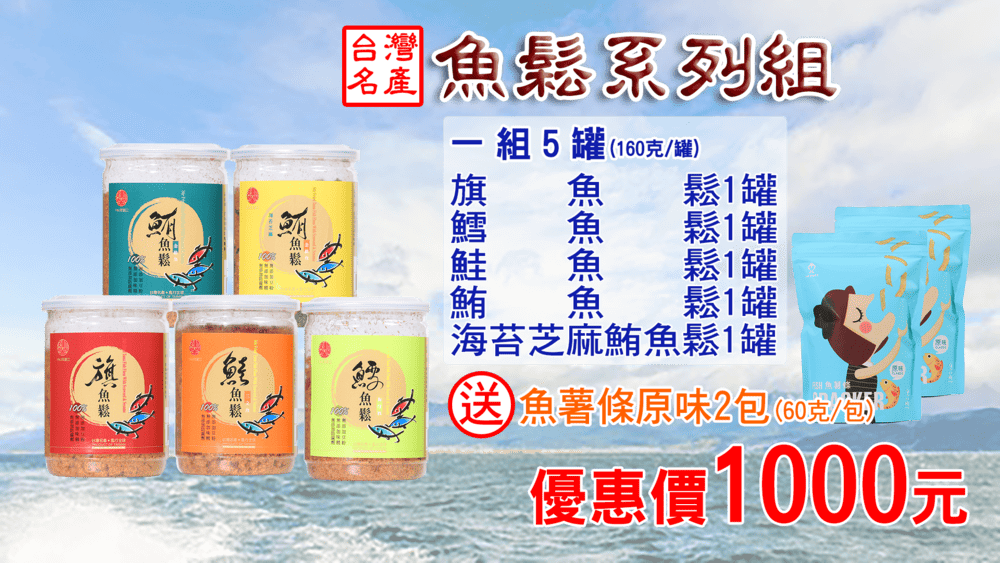 組合:海苔芝麻鮪魚鬆、旗魚鬆、鮪魚鬆、鮭魚鬆、鱈魚鬆各1罐+魚薯條2包