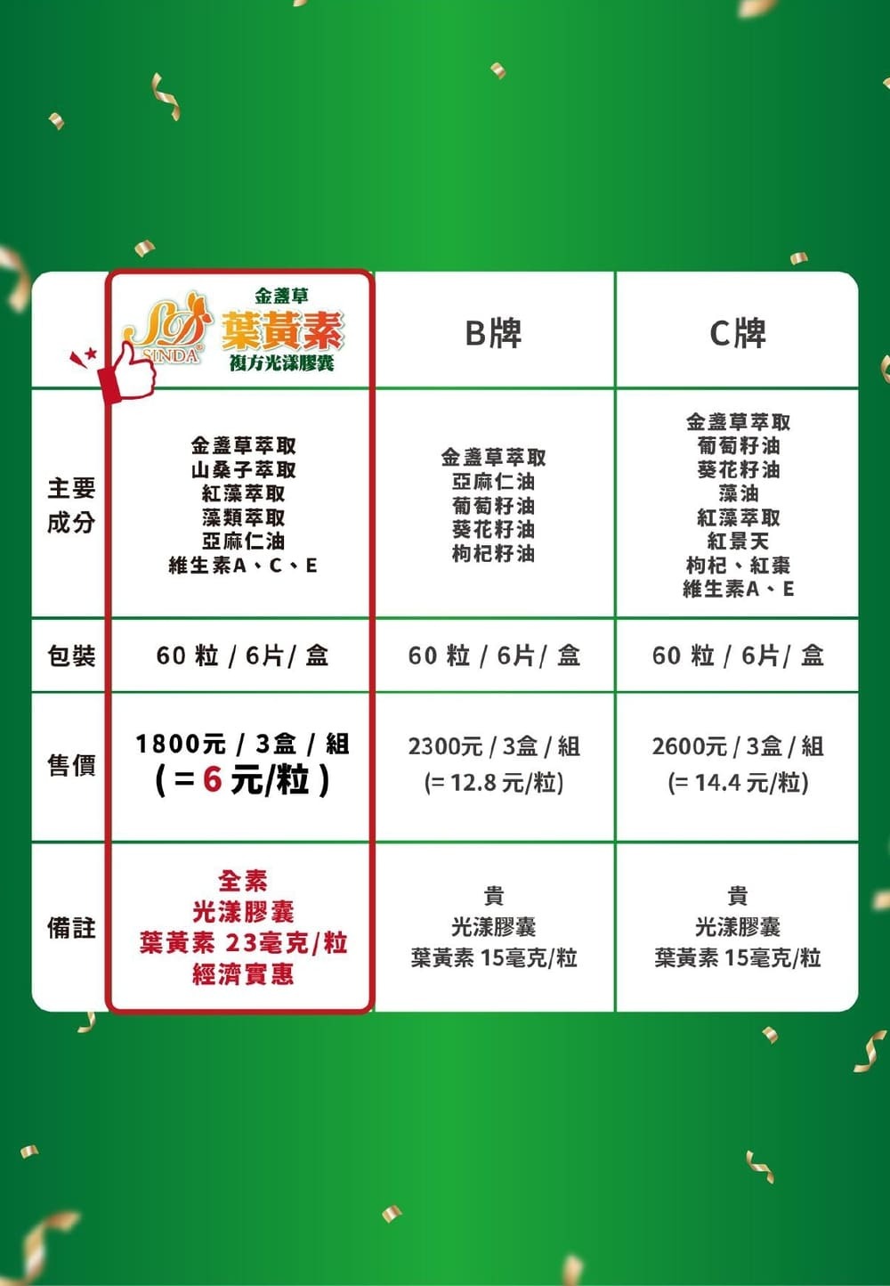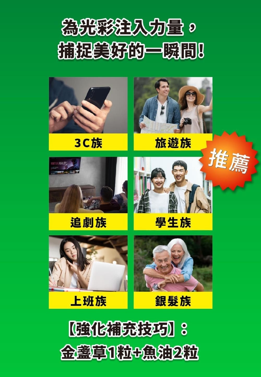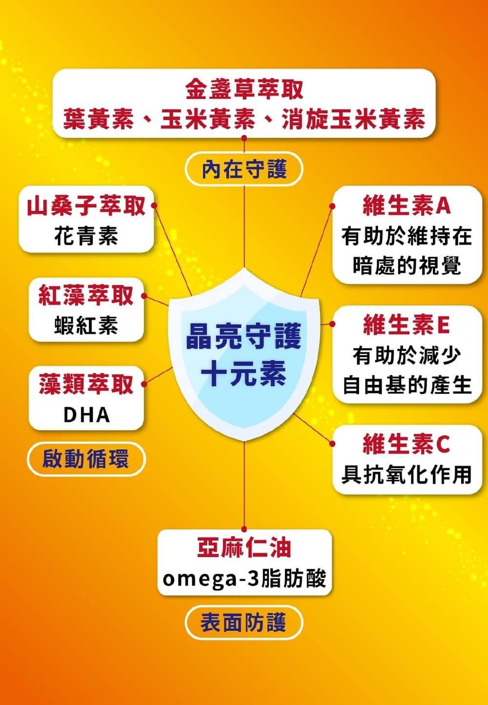 內容物:金盞草萃取(含葉黃素酯)(金盞草萃取、中鏈三酸甘油酯、維生素E(抗氧化劑))、亞麻仁油、維生素C、山桑子萃取粉(山桑子萃取(山桑子萃取、麥芽糊精)、維生素A乙酸脂粉(乾燥葡萄糖漿、阿拉伯膠、玉米澱粉、維生素A乙酸脂、維生素E(抗氧化劑)))、維生素E、藻類萃取粉(含DHA)(葡萄糖漿、DHA藻油、辛烯基丁二酸鈉澱粉、D-甘露醇、葵花油、L-抗壞血酸鈉(抗氧化劑)、脂肪酸甘油酯、多磷酸鈉、磷酸鈣、香料、混合濃縮生育醇(抗氧化劑)、卵磷脂、L-抗壞血酸棕櫚酸酯(抗氧化劑))、紅藻萃取(含蝦紅素)(海藻酸鈉、豌豆蛋白、羥丙基纖維素、水、混合維生素E(葵花子油、維生素E)(抗氧化劑)、紅藻萃取)、金盞草萃取(含葉黃素、消旋玉米黃素、玉米黃素)(玉米澱粉、金盞草萃取、檸檬酸、L-抗壞血酸棕櫚酸酯(抗氧化劑))壞血酸棕櫚酸酯(抗氧化劑))