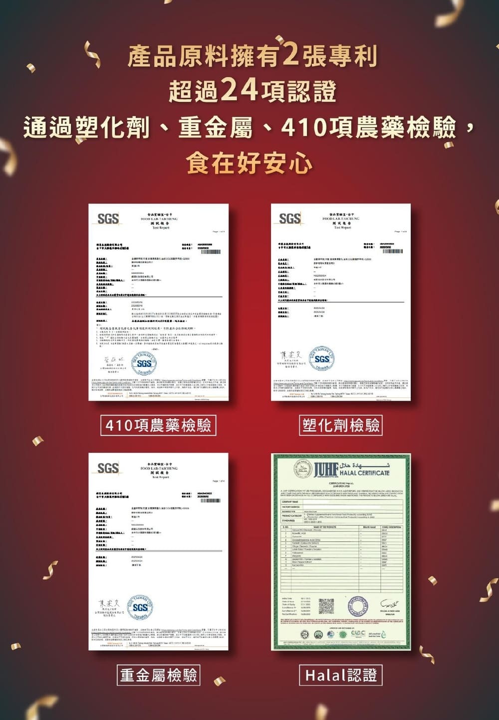 膠囊成分:羥丙基甲基纖維素、純水、鹿角菜膠、食用紅色六號、二氧化鈦、氯化鉀、食用藍色一號