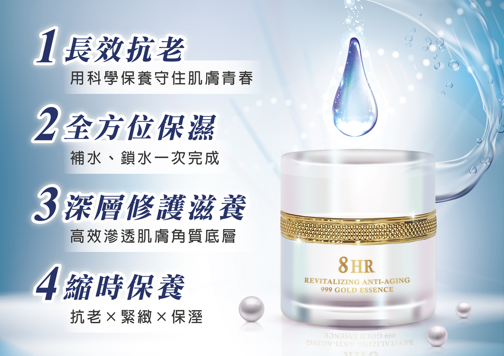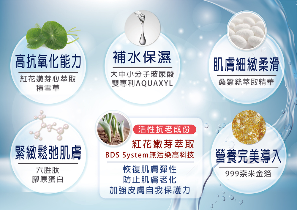 *999金箔:經過奈米化處理後,金箔代有負離子,利用產生微理循環能量,協助導入營養成分吸收,增加肌膚活力彈性。