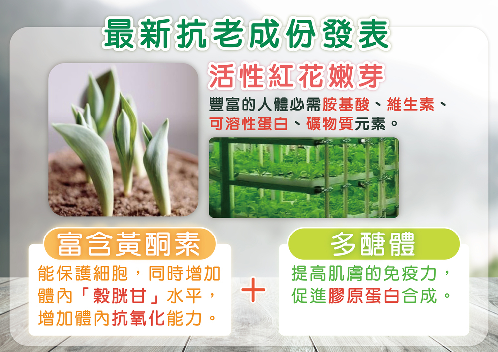 *紅花花芽抗老精萃:提供強效的氧化功能,促進肌膚對於外在刺激的自我保護力。