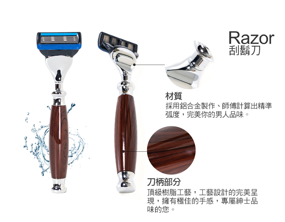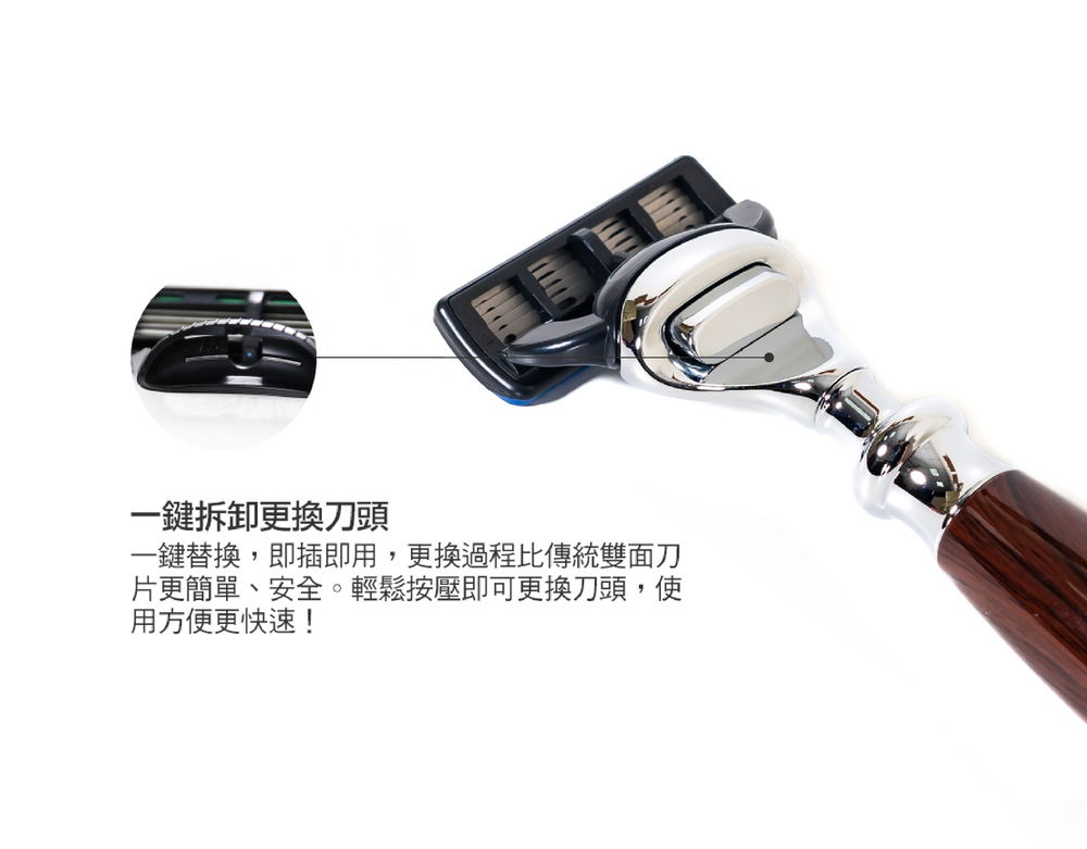 採用豪華車品牌鍍鉻工藝與鋁合金材質,完美呈現男人品味的刀具,刀片採用歐洲鋼材製作而成,堅韌且鋒利的刀片使得刮鬍非常的輕鬆俐落,搭配安全裝置完美服貼肌膚角度讓刮鬍過程大幅降低受傷與鬍子拉扯的機率,全金屬材質刀身,完美的重量配比,手感操控性極佳,讓男人專屬的儀式感為您開啟每一天。